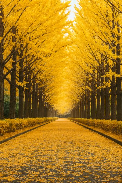 かわいらしい扇型の葉っぱが一斉に色づくと、辺り一面が金色に輝いて見えます。落ち葉が地面を埋め尽くす「黄色い絨毯」の上を歩くのも、この季節ならではの楽しみです。