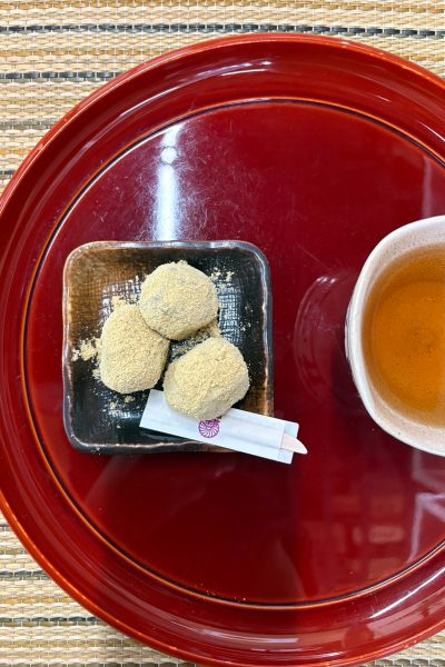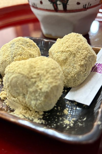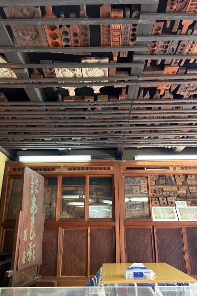 きなこをまぶした、一口サイズのあんこ餅菓子!!冗談抜きで100個食べられる!!そしてお店の天井には餅型が沢山!!
